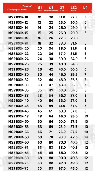 | MS2100K 16 | 16 | 26 | 27.0 | 29.0 | 6 |