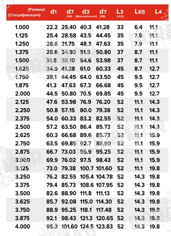 | Размер, спецификация | d1, мм | d7, мм | d3, мм | d7, мм | L3, мм | L65, мм | L4, мм |